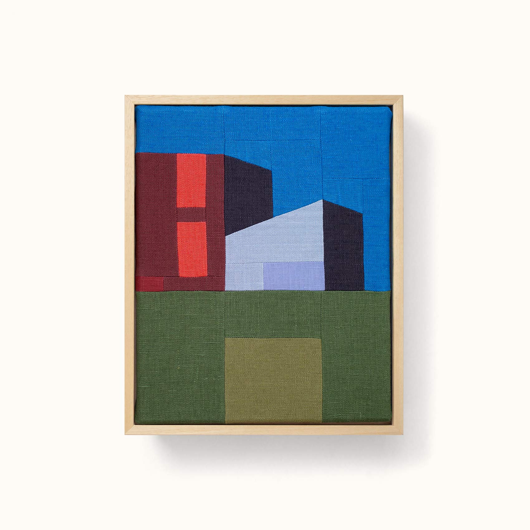 dans une approche artisanale proche du patchwork, jacques compose et assemble des pièces de lin, pour donner vie à des maisons et des paysages aux architectures abstraites et minimales.
